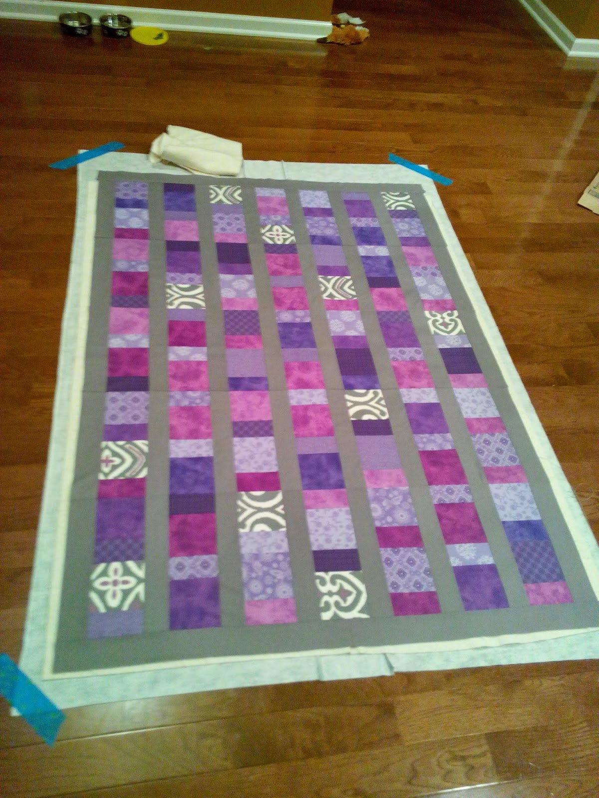 I always lay out my layers on the floor and tape them down using painters tape, so the backing went down first, then the batting, and then the top.